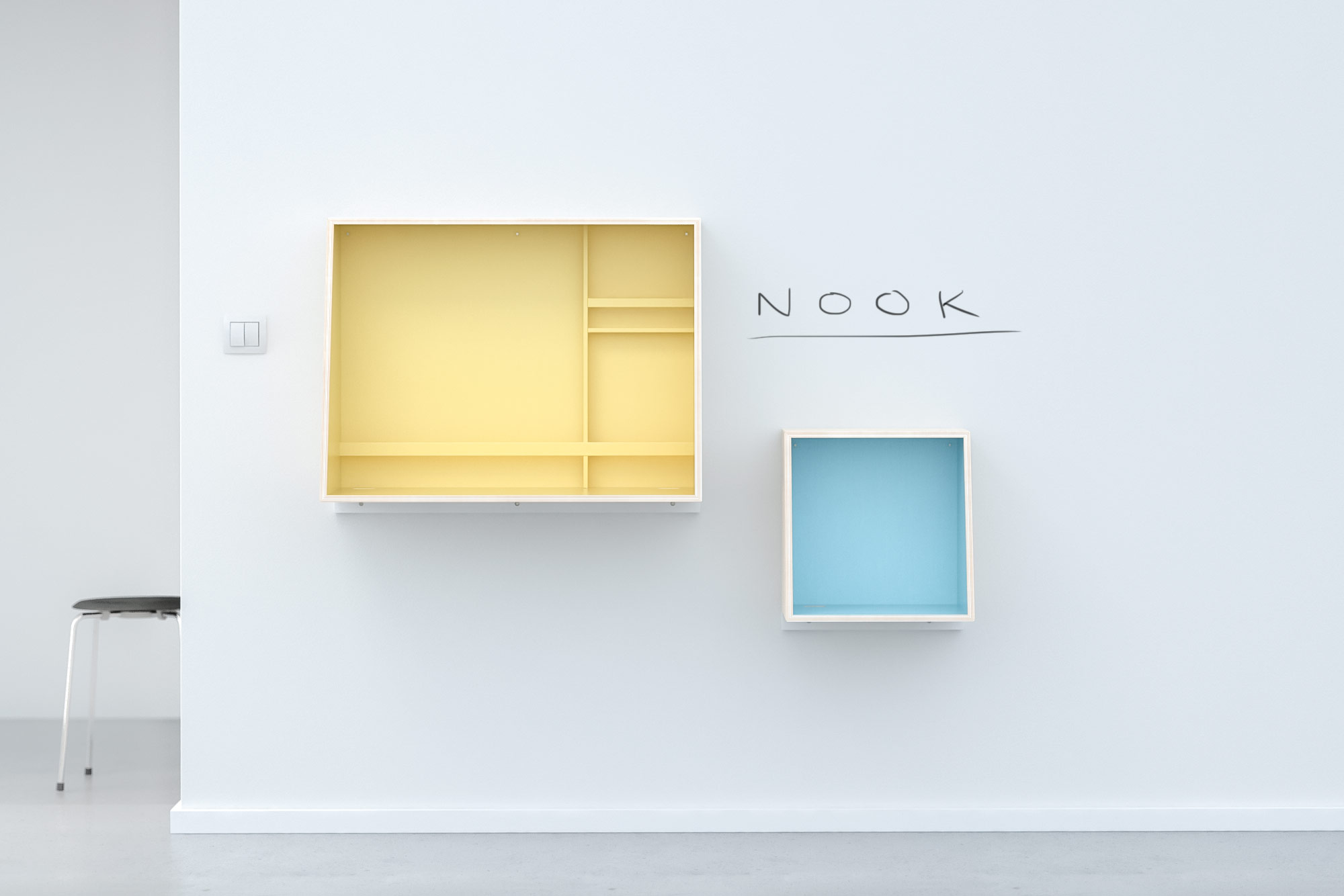 Two private work spaces. One for bills, phone calls and late night emails from the boss. And one for crayons, jigsaw puzzles and lego building. Nook is made from maple plywood and the larger one has basic storage for two laptops and bits of paper, bills, notepads and whatnot.
